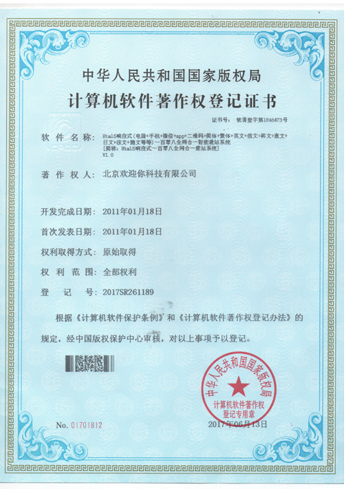北京歡迎你科技有限公司獲得多項(xiàng)版權(quán)局"計(jì)算機(jī)軟件著作權(quán)登記證書(shū)",并已獲得“全國(guó)誠(chéng)信經(jīng)營(yíng)示范單位”、“全國(guó)質(zhì)量服務(wù)客戶(hù)滿(mǎn)意誠(chéng)信企業(yè)”和“全國(guó)重合同守信用品牌企業(yè)”等榮譽(yù)稱(chēng)號(hào)。
